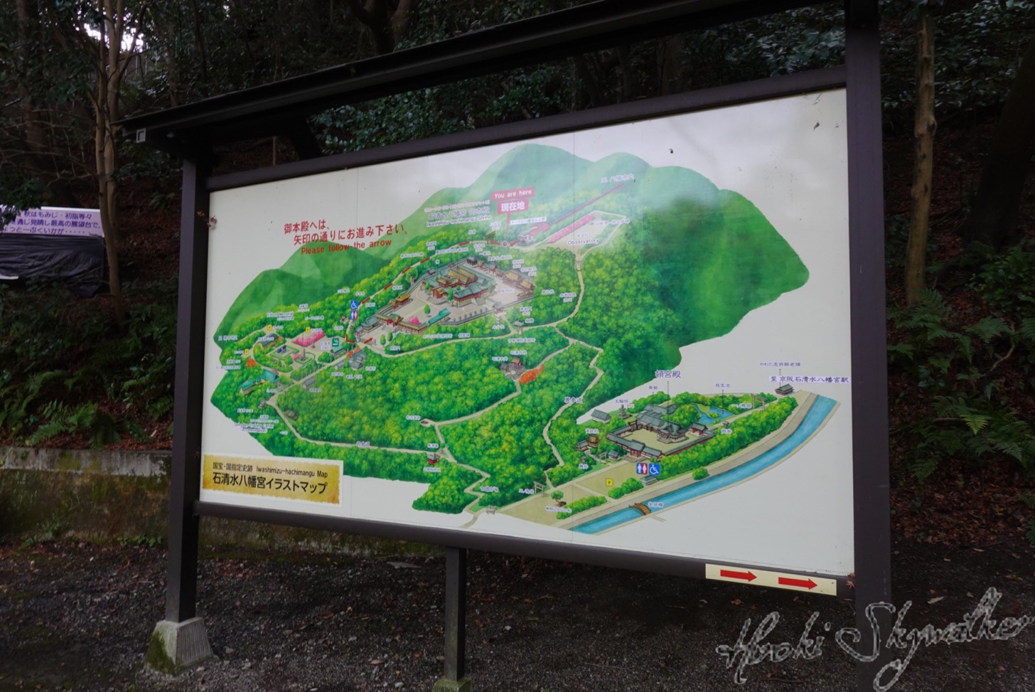 写真はいろいろ撮ったのですが、レタッチしたものを一つ。本殿の前に飾られている大きな矢は、新春期間限定だそうです。石清水八幡宮は、弓矢の神様としても崇められていますし、那須与一が祈った八幡大菩薩は、ここに祀られる応神天皇のこととされていますね。