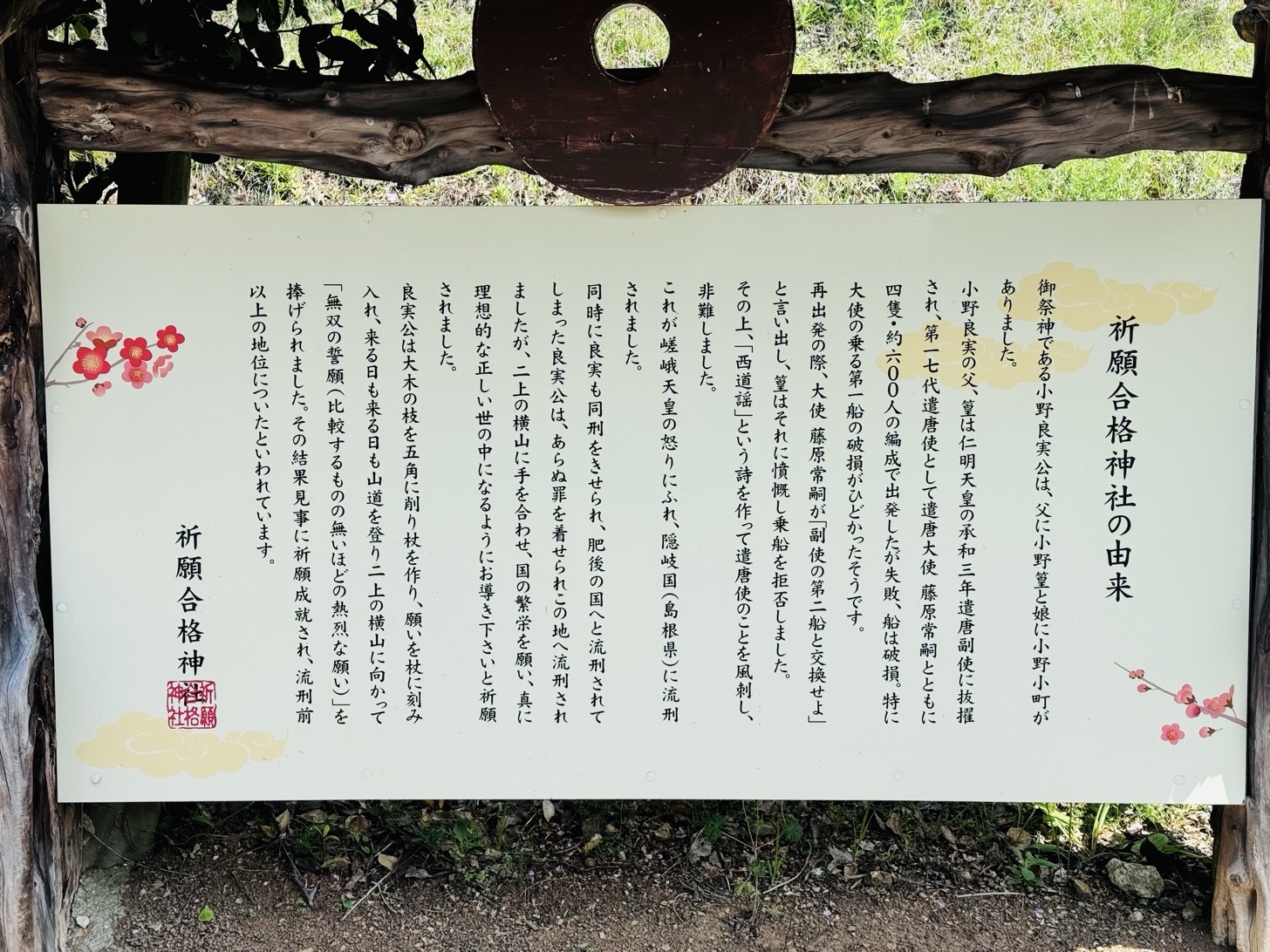小野小町のお父さん、ね。祈願成就を祈る、祈願合格棒というのがあって、それをいつも握りしめていると願いがかなうとのこと。そして祈願が成就するとお返しするのだそうです。