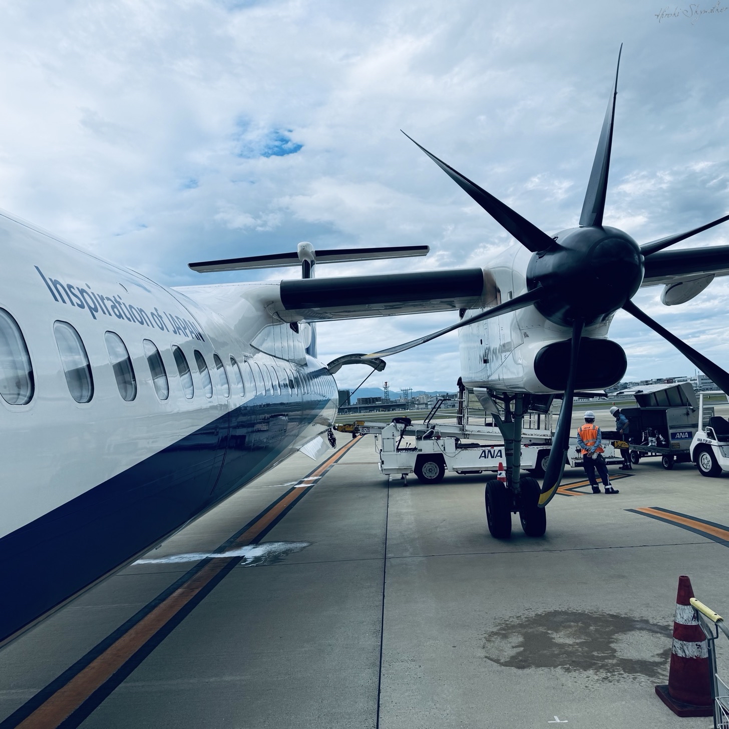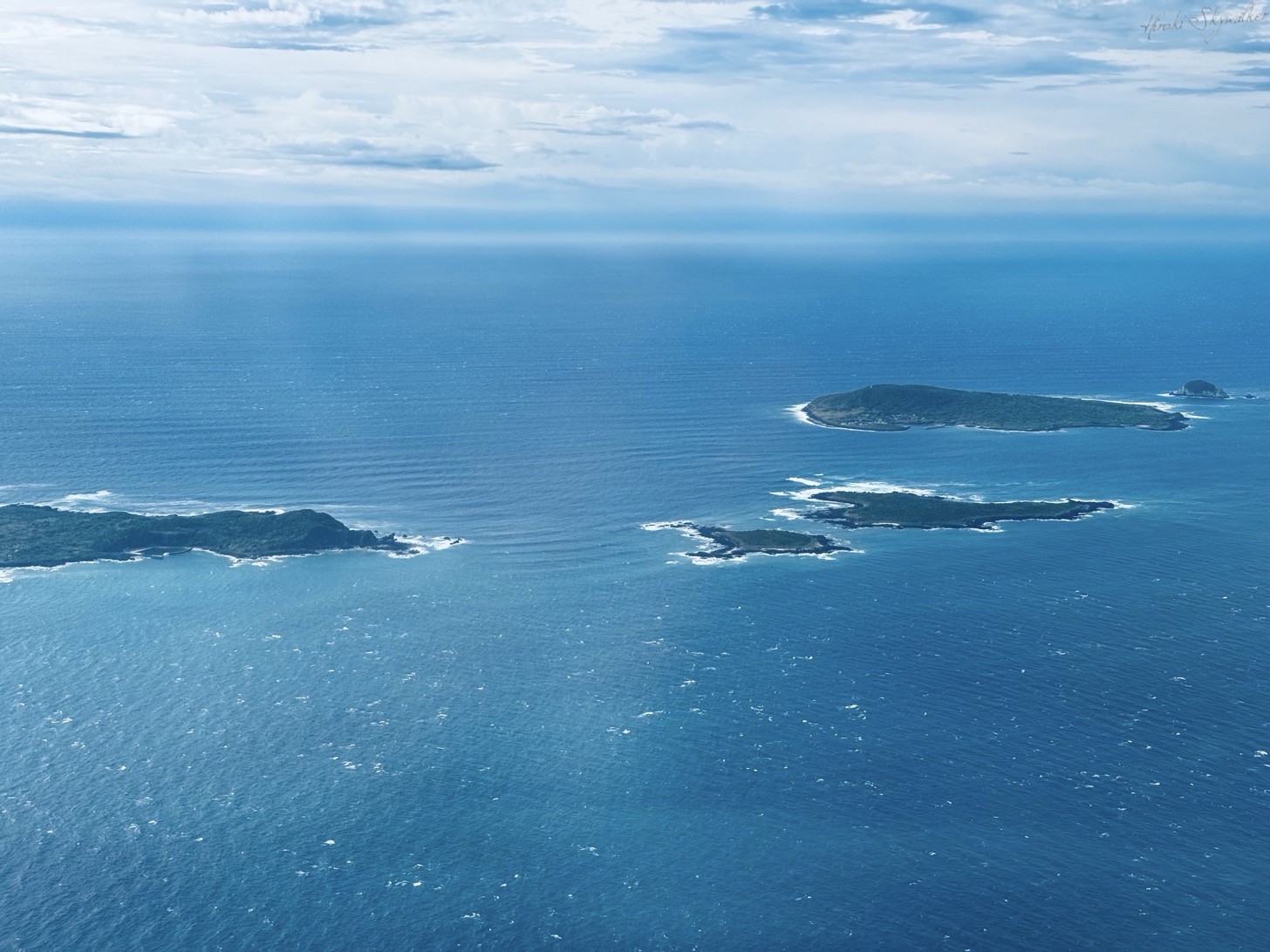 その前に、まだ晴れていた時の、五島行きの飛行機と飛行機からの島の風景。